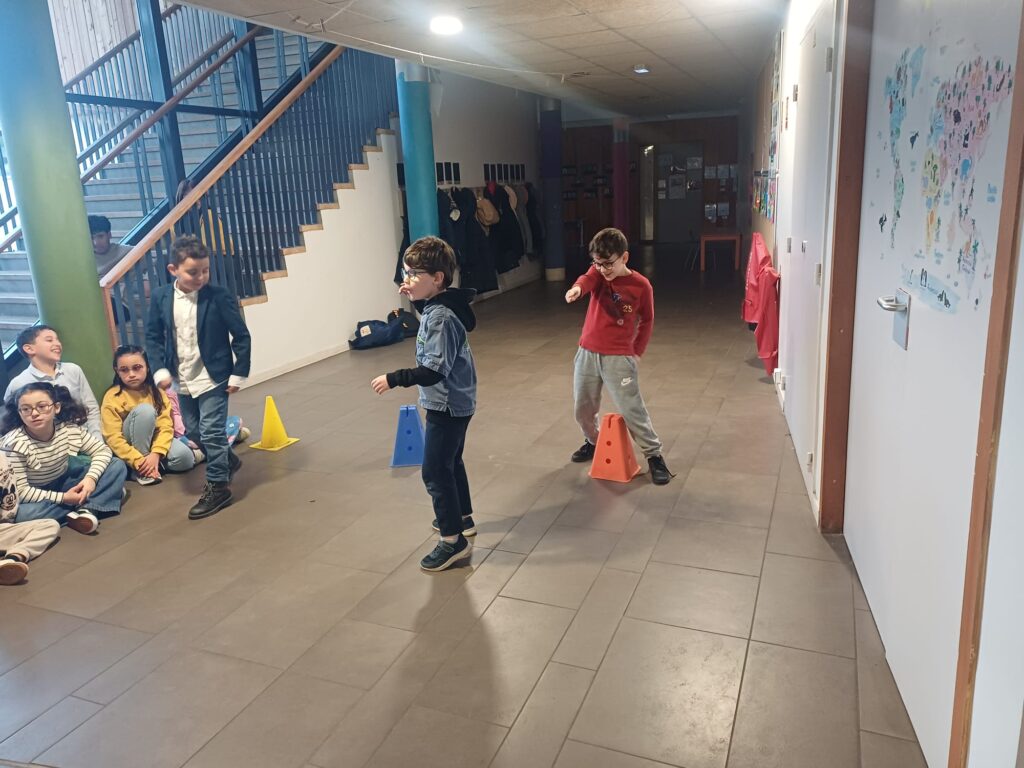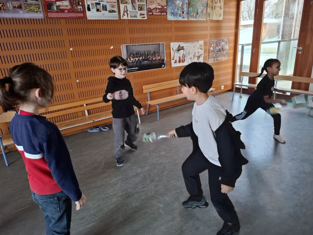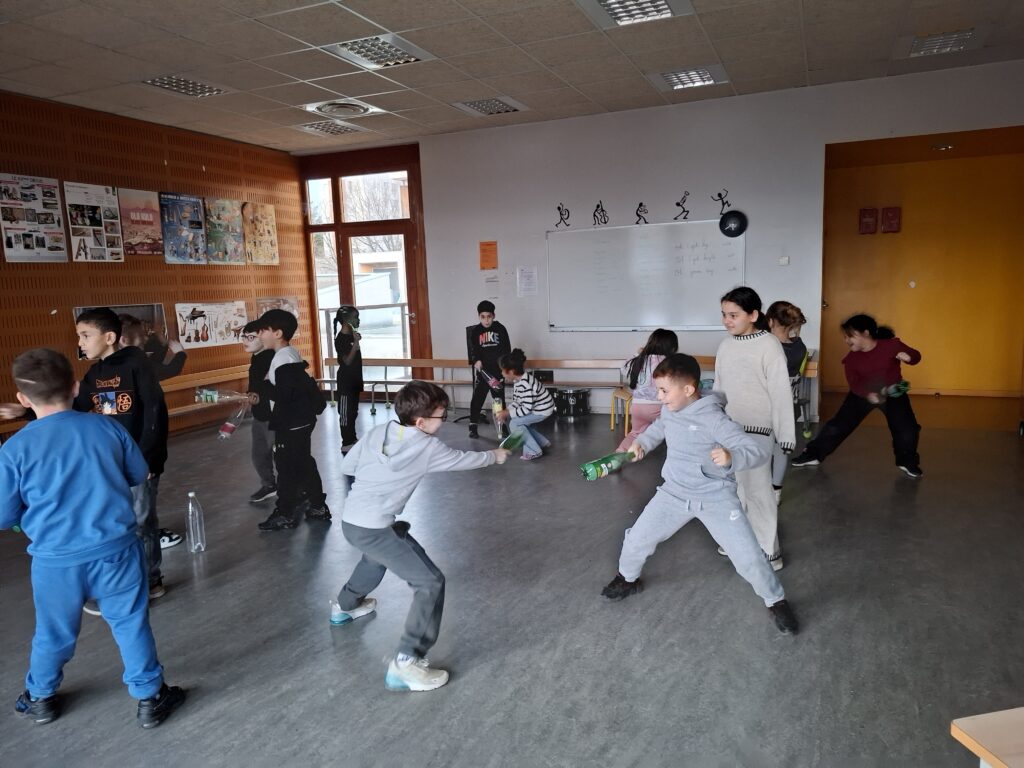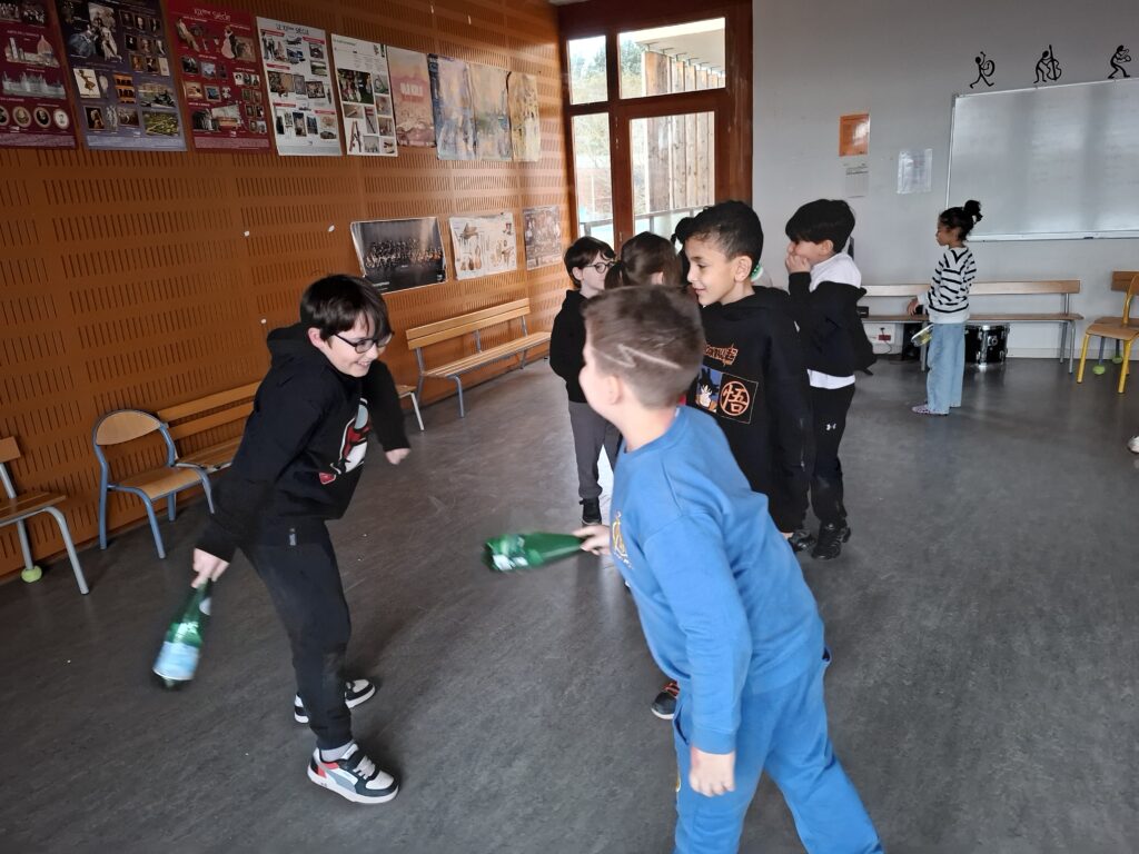 En éducation physique et sportive, nous faisons de l’escrime bouteille. Le but est de toucher l’adversaire avec sa bouteille. Nous avons appris à faire le salut, la marche, le retrait, la garde et la fente. Pendant les affrontements, il y a toujours un arbitre.